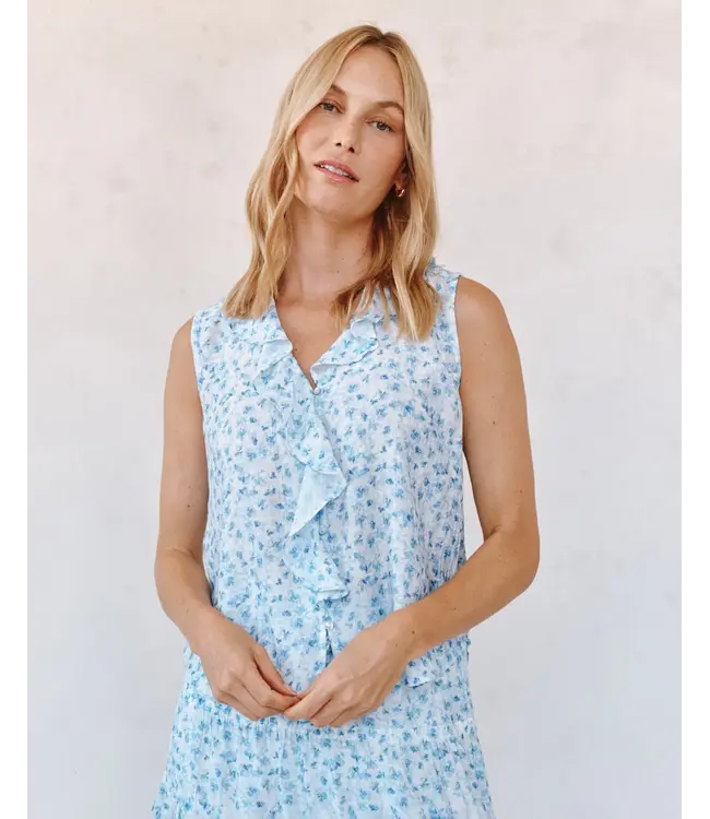 The Sleeveless Ruffle Top features a soft V-neckline with delicate ruffle detail and a relaxed, easy silhouette.
