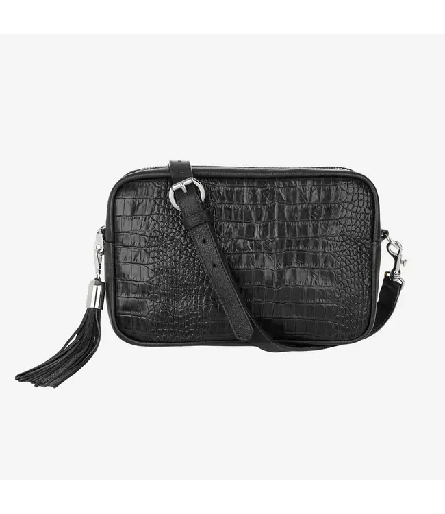 Meet the Sonnet bag. This hand-crafted shoulder bag features croc-embossed leather with a pebbled nappa leather trim. Includes an adjustable leather shoulder strap, and removable leather tassel.
