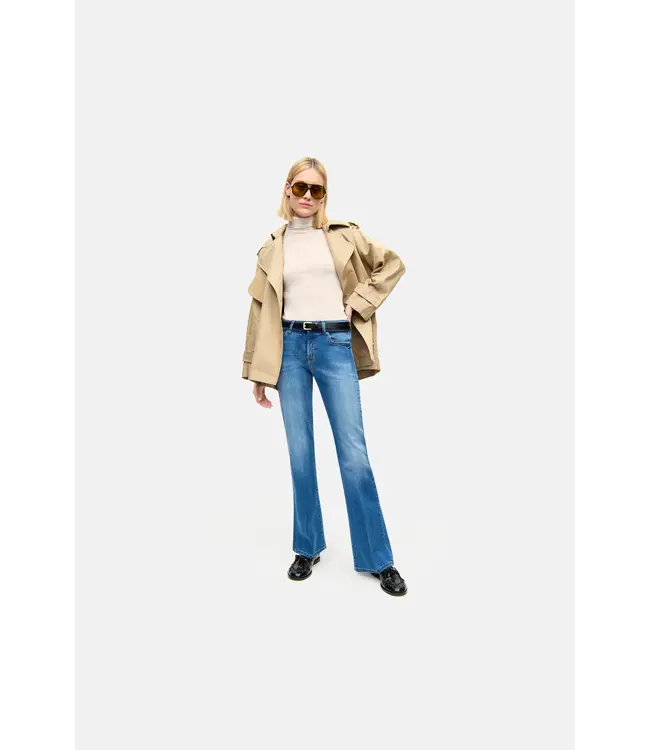 Paris full-length flared jeans with a flared leg silhouette. The denim is made of sustainable organic cotton and its elasticity ensures comfort and a perfect fit. Available in blue and dark blue.