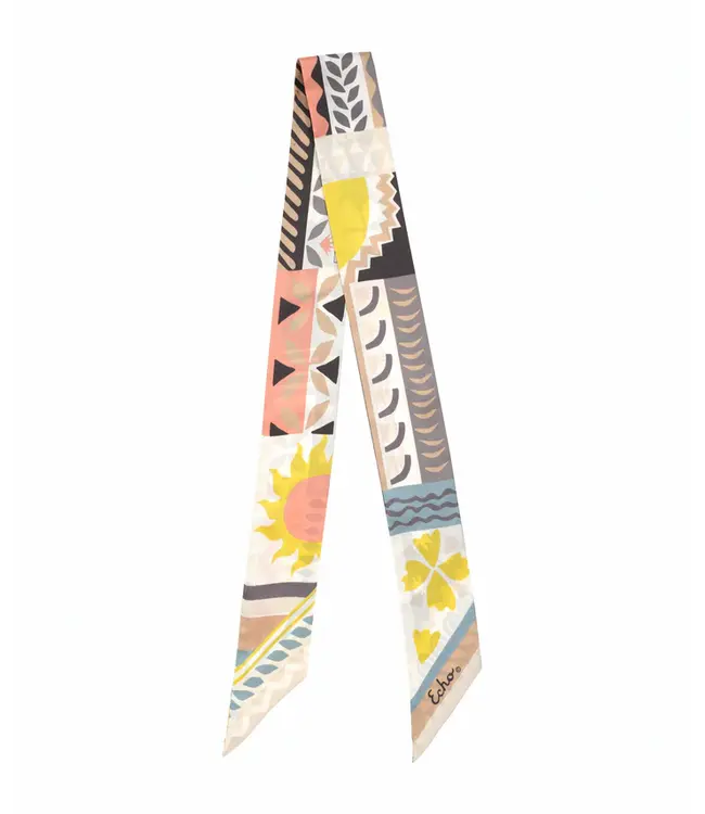 This silk ribbon scarf is inspired by modernist cut-out collage, featuring stylized motifs of flowers, suns, and waves. Its bold, graphic compositions emphasize color, form, and movement, resulting in a refined and artful accessory.