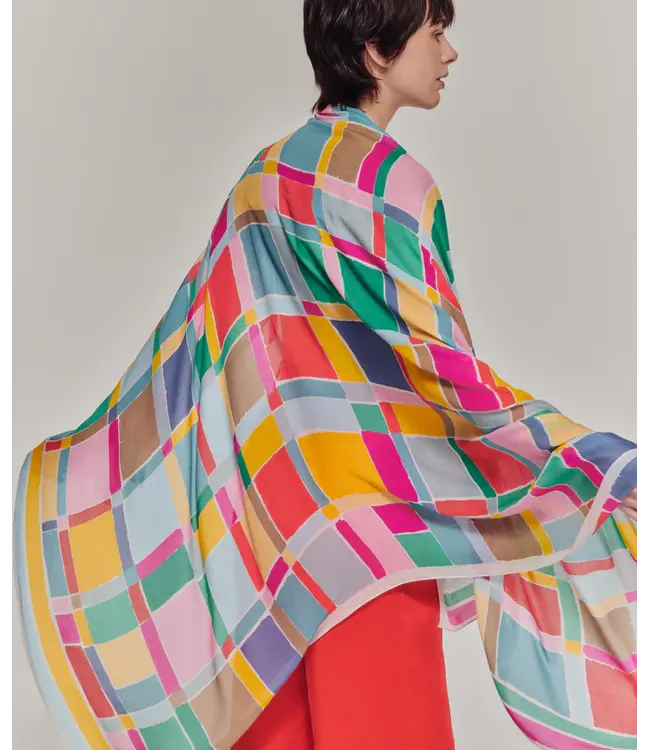The Painted Plaid Wrap transforms the familiar structure of plaid into a graphic, painterly composition. Layered colors and expressive brushwork break up the grid, giving the Painted Plaid Wrap energy, movement, and a distinctly modern feel.