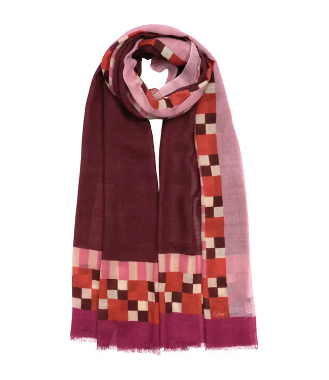 Drawing inspiration from mosaic tiled floors and quilting patterns, this wrap features a striking solid color center that anchors the intricate design, creating a balanced and elegant statement piece.