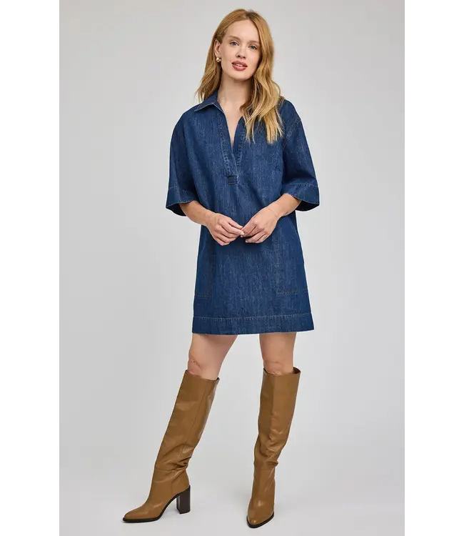 The Evelina dress is made of a denim fabric that has been specially washed for a perfectly lived-in look. Features include a collar with a v-neckline and side seam pockets.