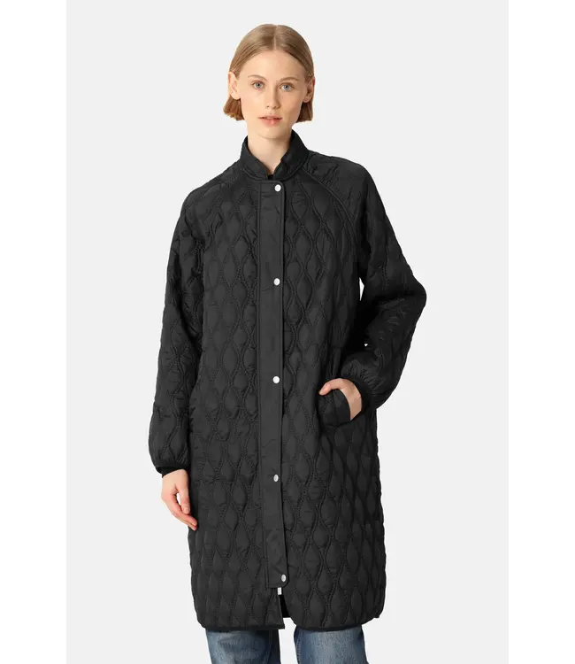 An oversized, embroidered quilted jacket with a front windshield placket with logo buttons and a two-way zipper for extra closure. A small mock neck and slanted jetted front pockets offer both style and functionality. Dropped raglan sleeves and a gathered back yoke for volume and attitude.