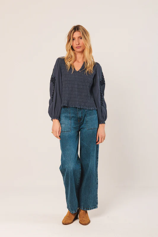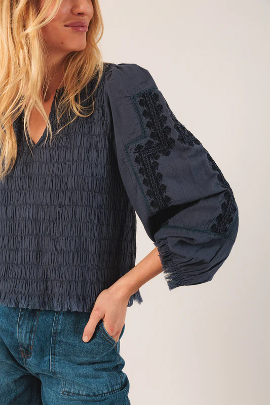 • Ethnic embroidery on the sleeves and finished on bottom hem and cuffs with frayed trim
