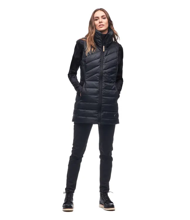Full zip sleeveless tunic with stand-up collar. Secure zippered pockets.