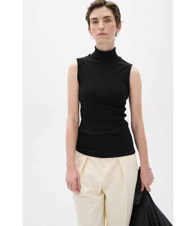 This ribbed sleeveless turtleneck top features a slim fit and soft, comfortable fabric. The high neckline and streamlined silhouette make it ideal for layering or standalone style, offering versatility for any occasion.