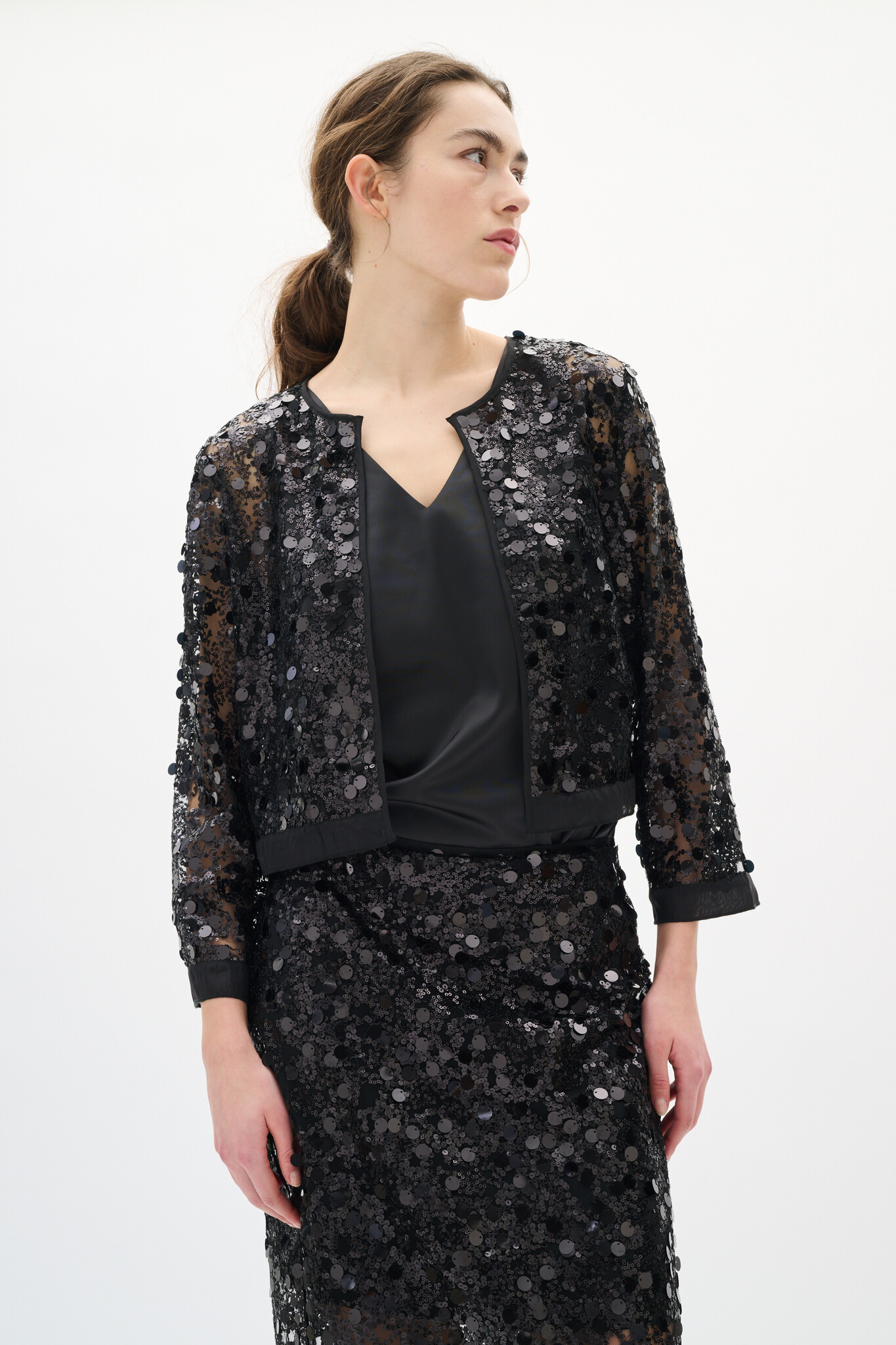 Create an accountThis sequin cropped jacket is tailored with a relaxed fit, round neckline, and open front design. The shimmering surface and long sleeves create versatile style for evening events or elegant layering, offering both comfort and chic appeal.