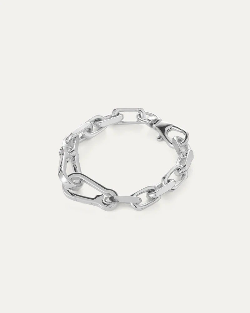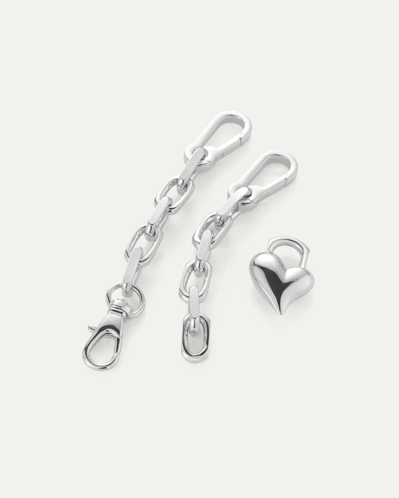 Create an accountA removable heart charm is hooked onto a chain bracelet's crisp, faceted links with small carabiner clasps. The chain can be split in half and used as a small bag charm or keychain. Finished in high-polish silver.