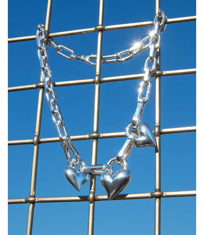 Three removable hearts are hooked onto crisp, faceted links. Play around with this chain to achieve different looks: remove one, two or all three hearts using the mini carabiner clasps, or split the chain in half to use it as a bag charm or keychain. Finished in high-polish silver.