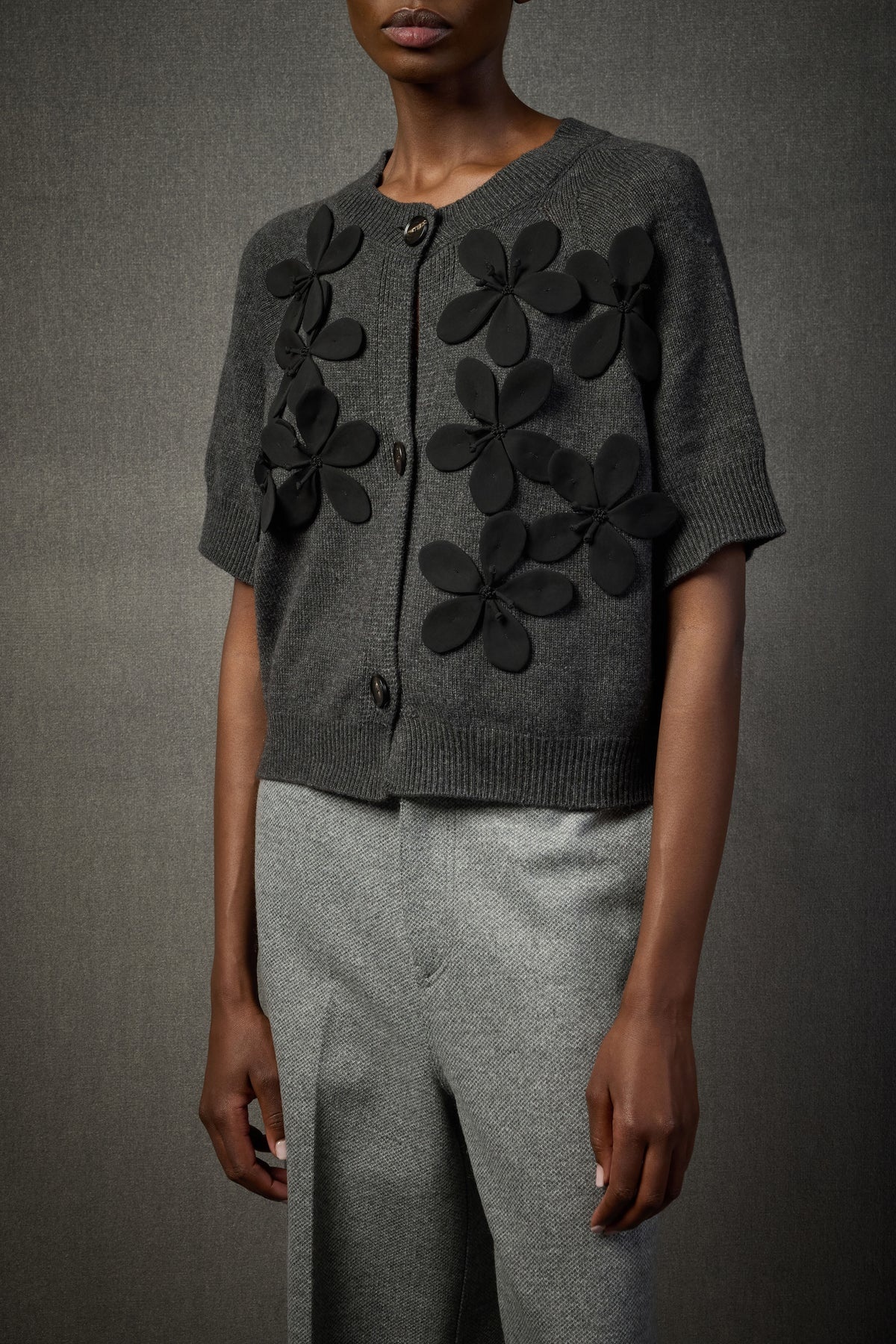 Create an accountSHORT-SLEEVED KNIT IN HAND-EMBROIDERED RECYCLED CASHMERE, WITH LARGE BLACK FLOWERS APPLIED ON THE FRONT AND CENTRE BUTTON FASTENING.