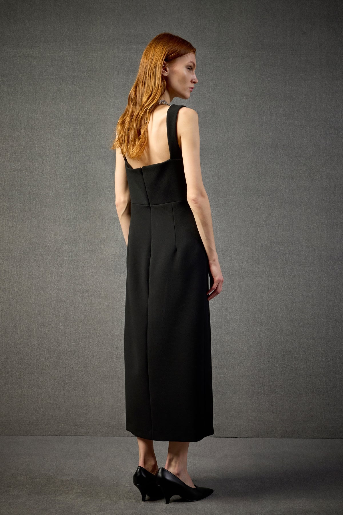 Create an accountBLACK LONGUEETTE DRESS IN FLAIR CREPE WITH V-NECK, WIDE STRAPS AND SLIT ON THE RIGHT FRONT.