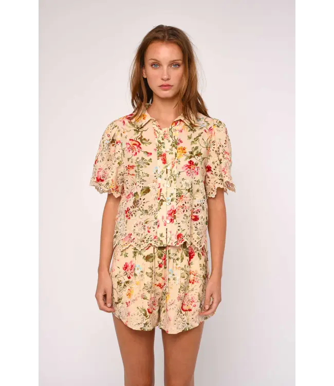 One of Love the Label's Best Sellers, comes in a new decorative placed eyelet emboridery at the bottom sleeve and bottom hem. This Abigail top in gorgeous vintaged inspired floral is short sleeve top buttons down the front.