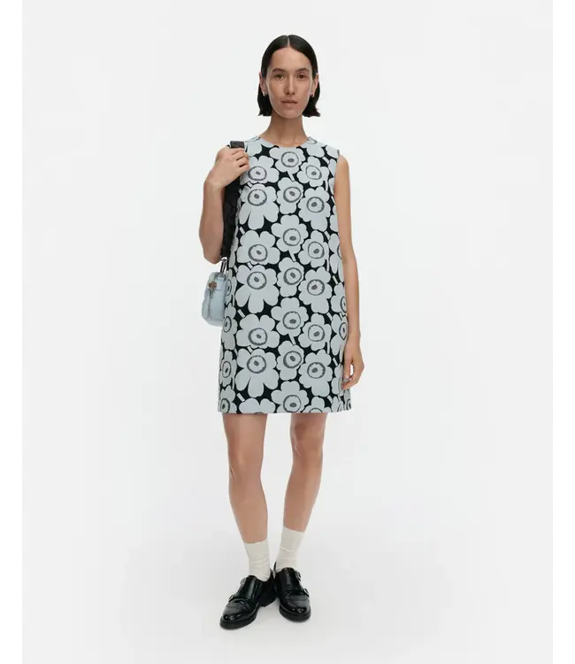The sleeveless Hahmo dress has a slim, A-line fit and it features the jacquard knit Unikko pattern. The dress has an O-neck with a concealed zipper in the central back seam, side seam pockets, and bust darts that give the dress a more fitting shape. The dress is lined.