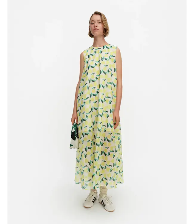 The Piirroot dress has a slim A-line fit and it features the Lemmitty pattern. The sleeveless dress has an O-neck in the front and a V-slit and button closure in the back neckline. The bust darts give the dress a more fitting shape. The dress has an inside lining that ends above the knee.