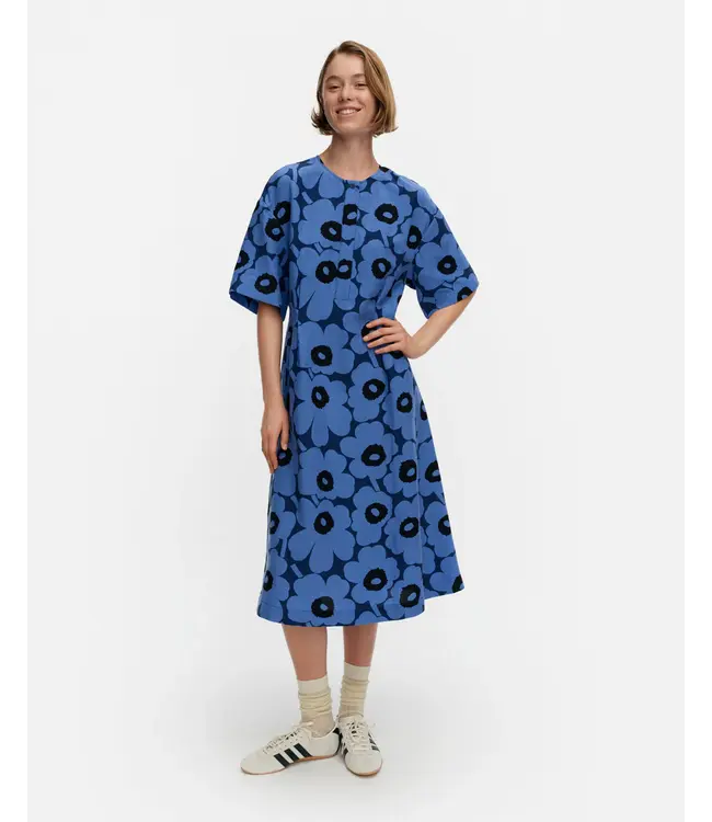 The Vuosi dress has a relaxed fit a straight top a flared cut hem and it features the Unikko pattern. The dress has an O-neck with a three-button list in the front and a concealed zipper in the back seam. The dress has short sleeves and side panels with pockets in the front seams. The pleats at the front and back waistline give the dress a more fitting shape.