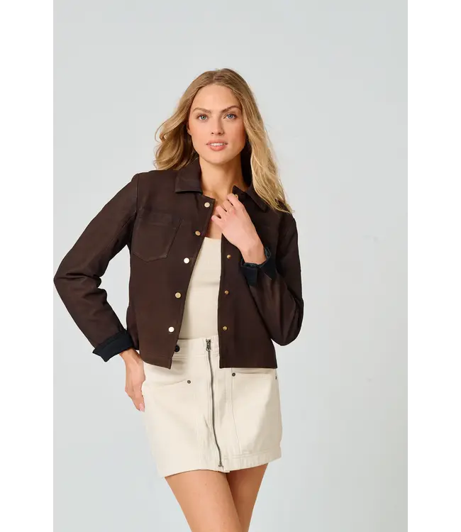 The Lefei Jacket blends style and comfort, making it the ultimate wardrobe staple. This cropped, collared shirt jacket is crafted with light leather bonded to a poly-cotton blend fabric, offering a unique and fashionable edge.