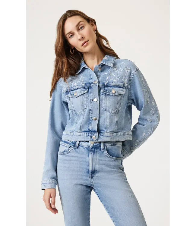 This denim jacket embraces spring with delicate floral embroidery on the sleeves, collar, and shoulders. Finished in a light blue wash, this jacket is perfect for throwing on over your favorite tee. Pair it with the New York Bloom pant for a head-to-toe floral look.