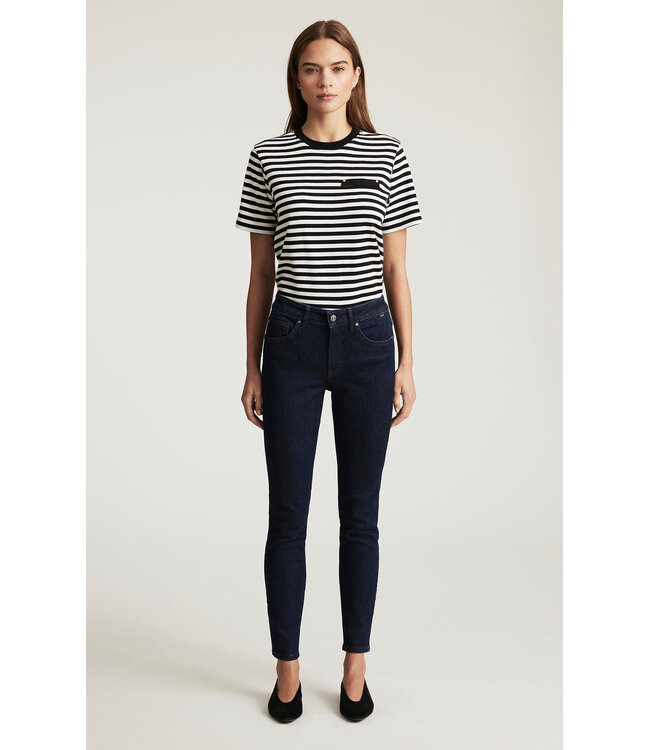Tess is a modern high rise with a super-skinny leg. The contemporary fit is often finished in an ankle length. This pair is finished in a midnight blue rinse wash.