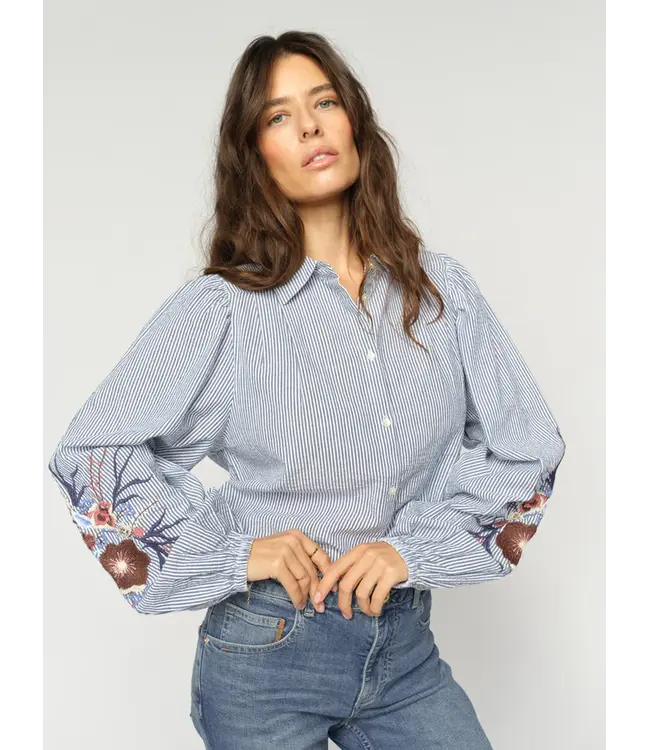 A classic cotton shirt with intricate embroidery on the sleeves for a feminine twist. Designed with a timeless silhouette, button front, and soft fabric that offers both structure and ease - perfect for dressing up or down.