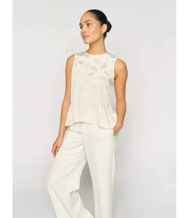 This sleeveless top exudes understated elegance with its delicate jacquard leaf pattern. Designed in a regular fit with a clean round neckline and button closure at the back, it drapes beautifully for a refined silhouette. Perfect for pairing with tailored trousers or skirts for a timeless, feminine look.