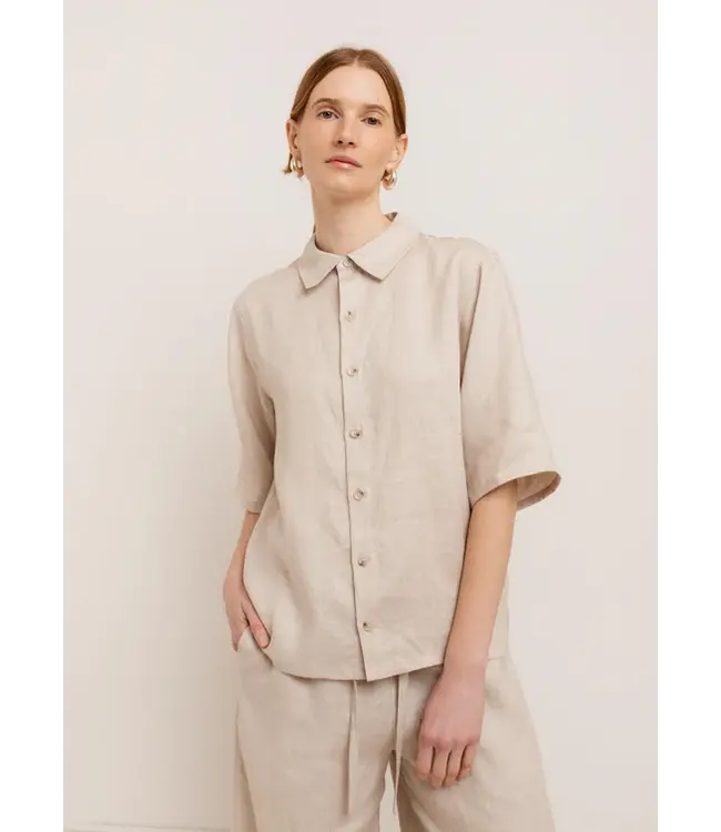 An easy statement with a utilitarian edge. The Kinsley Short Sleeve Shirt is crafted from 100% linen—naturally breathable and beautifully structured for warm weather. Designed with an oversized fit, it features a classic collar, button-front closure, drop shoulders, and wide short sleeves for a relaxed, modern shape.