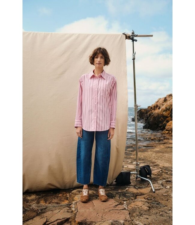 Striped shirt with a roomy straight fit, pointed collar and button front. Features a single chest pocket and long sleeves with cuff detail. Subtle vertical stripes accentuate the classic silhouette for easy styling.