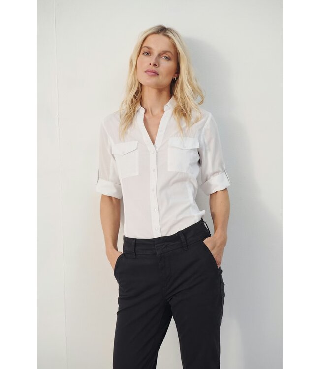 The model is 177 cm tall and wears a size 36. This lightweight cotton voile shirt features three-quarter sleeves, flap chest pockets, and an open V-neck without a top button. The fit is feminine and relaxed – ideal for warm days or layered under a blazer. Pair it with chinos or light shorts for a summery look.