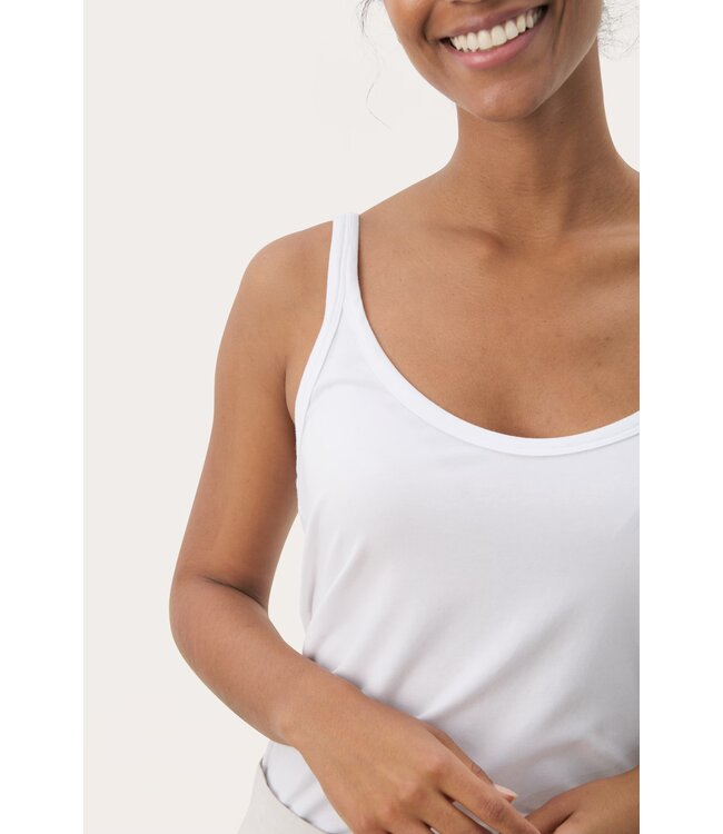 The model is 174 cm tall and wears a size M. This classic tank top features a round neckline and a slim fit in a soft and stretchy fabric. An essential wardrobe basic – ideal under shirts, cardigans or on its own during warm days.