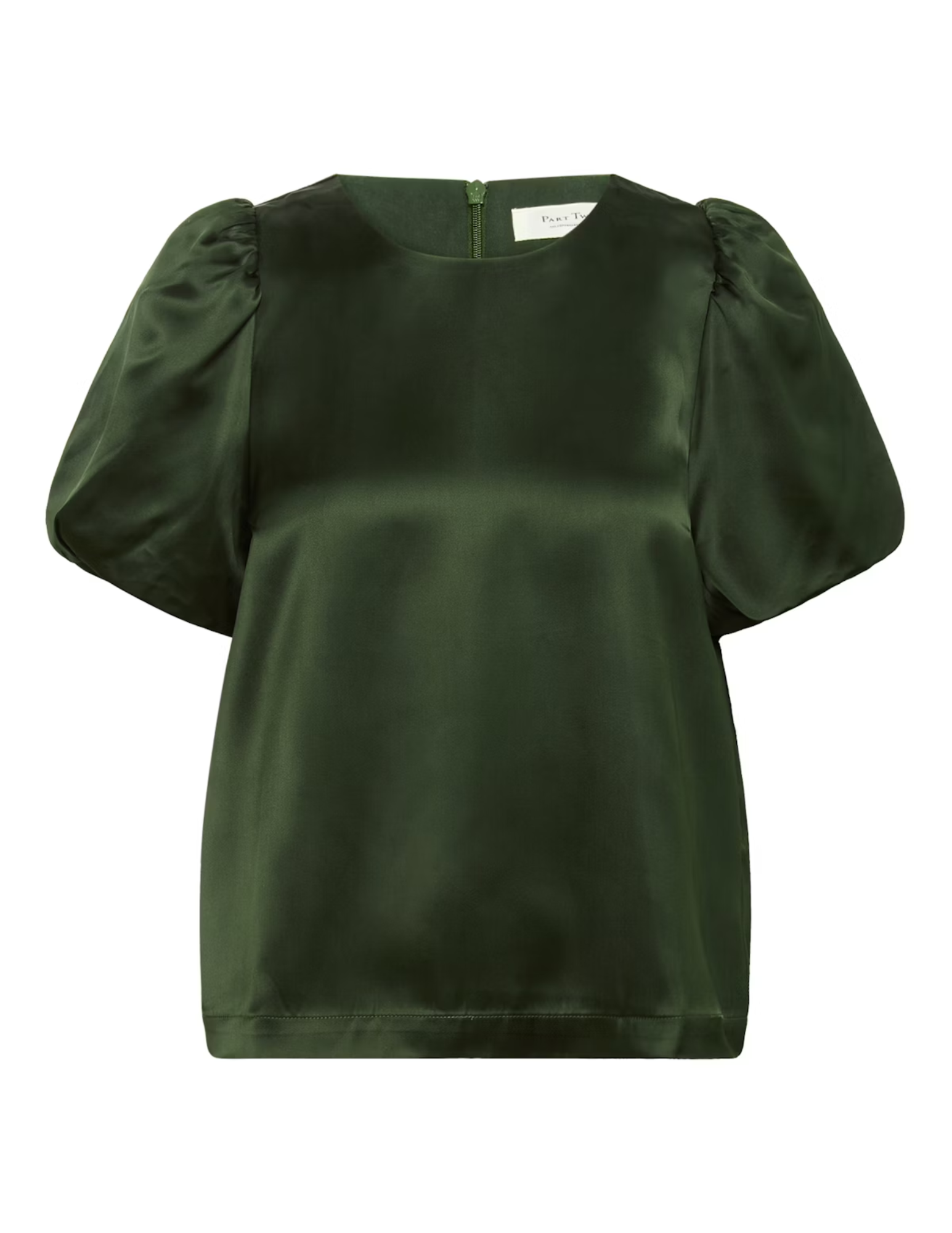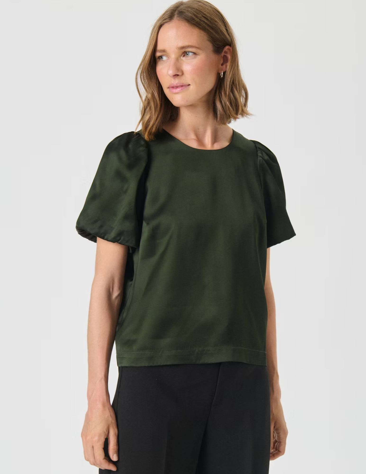 Create an accountThis short-sleeved blouse in shiny olive green fabric features a round neckline and subtle puff sleeves for an elegant look. Its simple cut makes it easy to style – perfect for both everyday wear and more refined occasions.