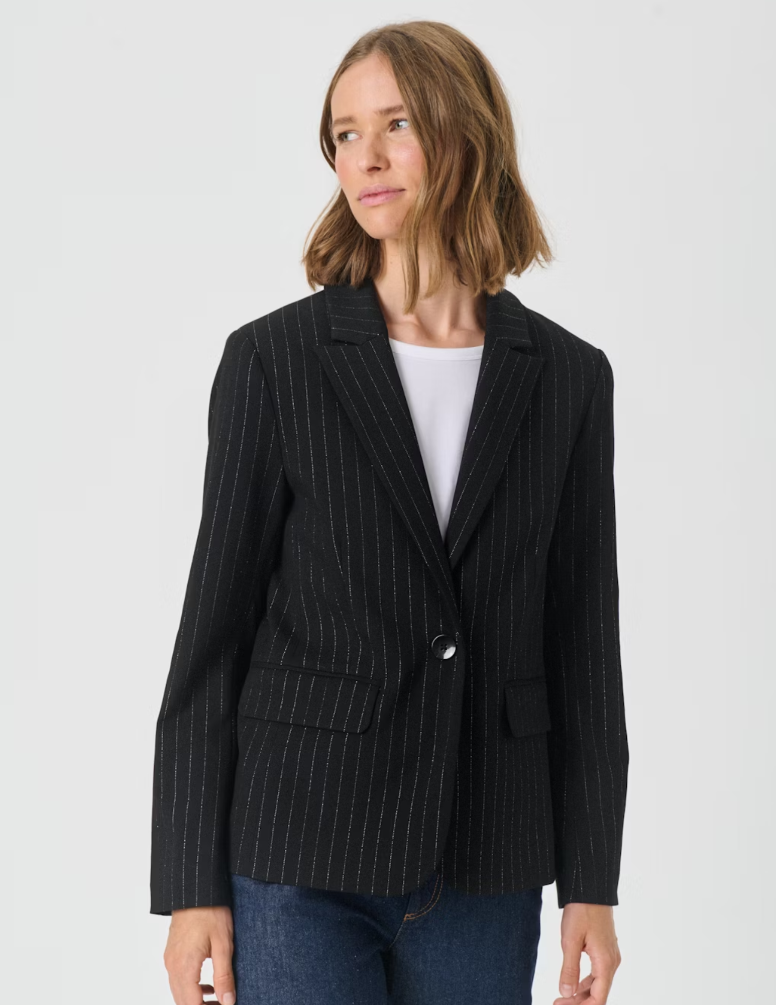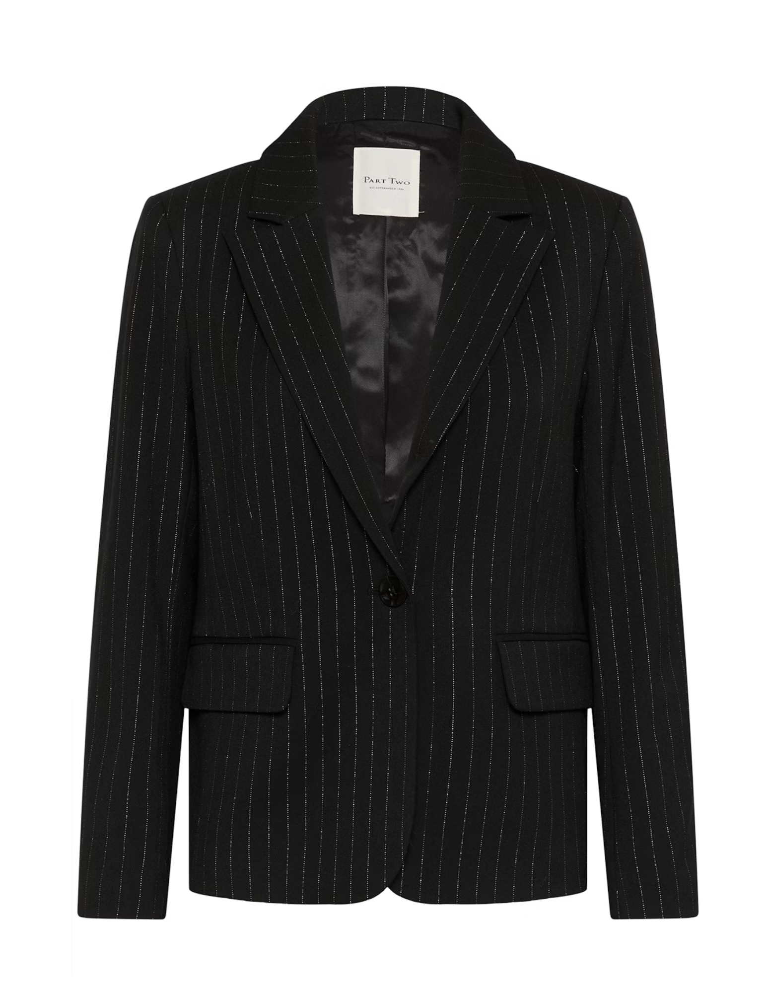 Create an accountThis black pinstripe blazer features a classic tailored silhouette with a single-button closure. The timeless design and sharp lapels make it ideal for both office wear and dressier occasions. Style it with jeans for a relaxed twist.