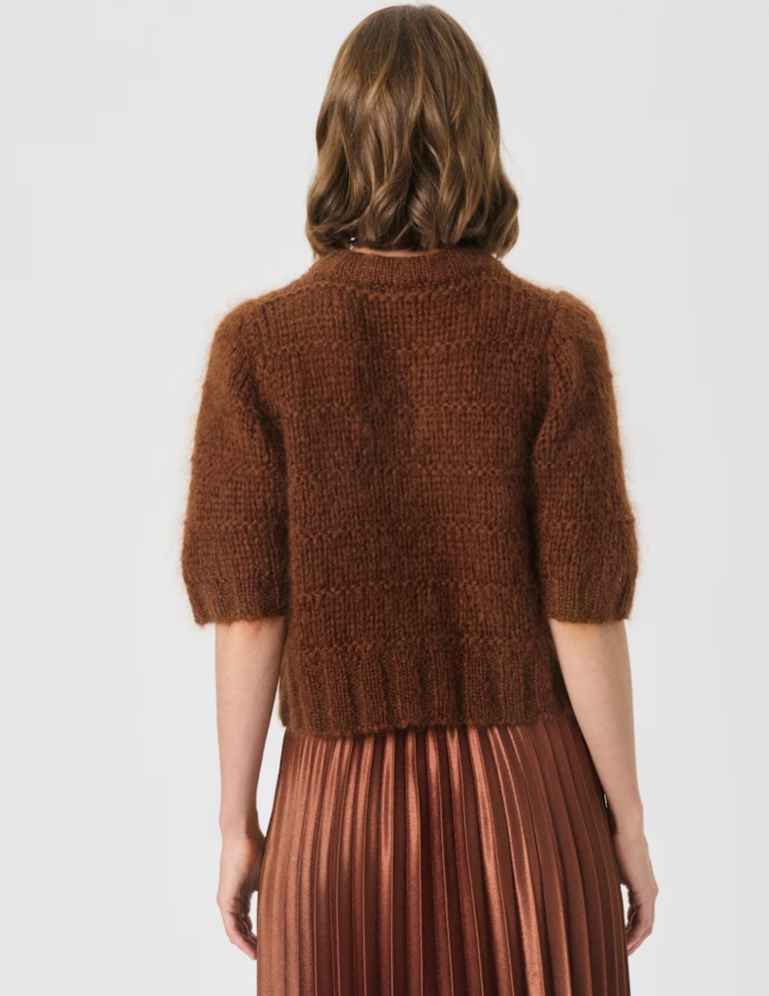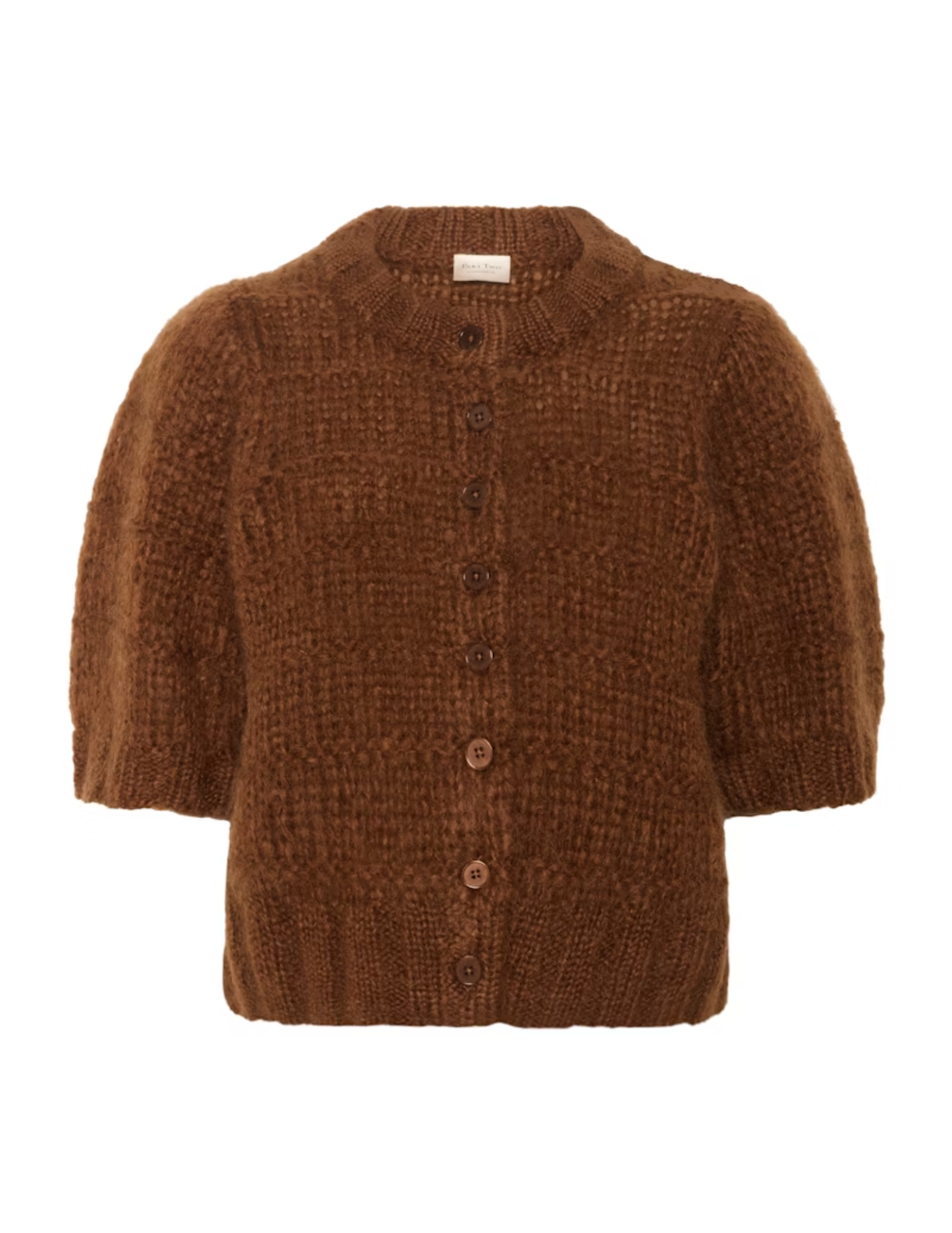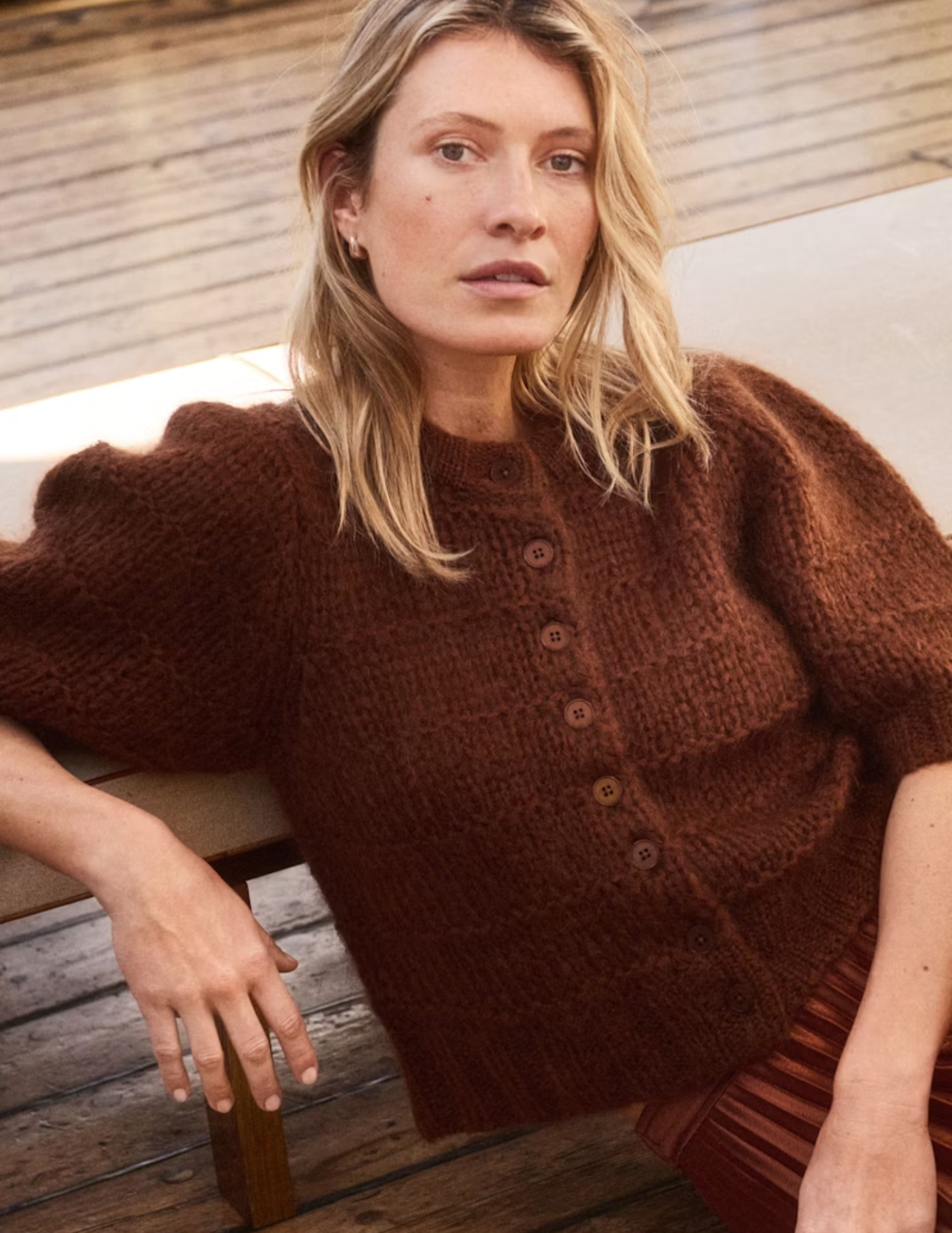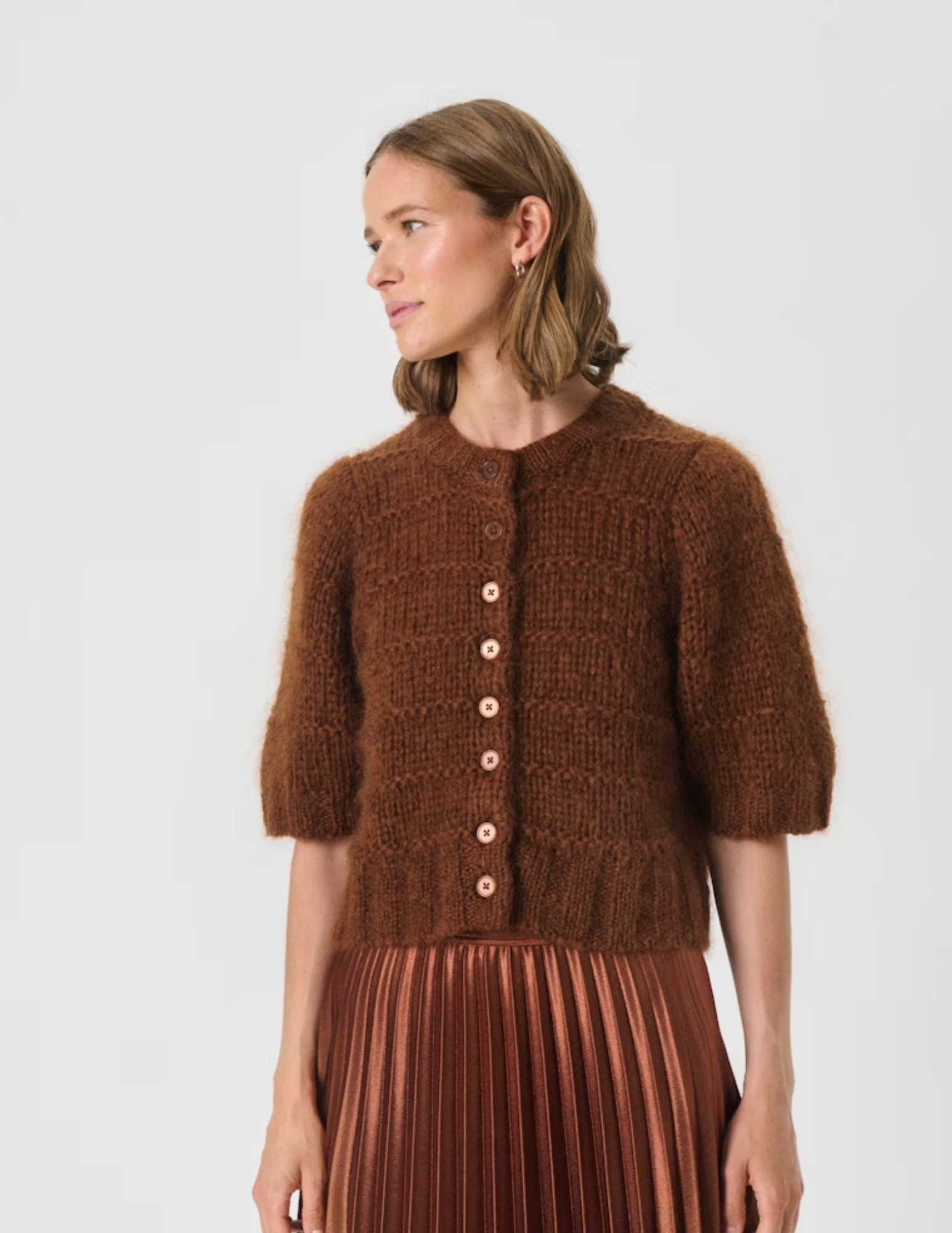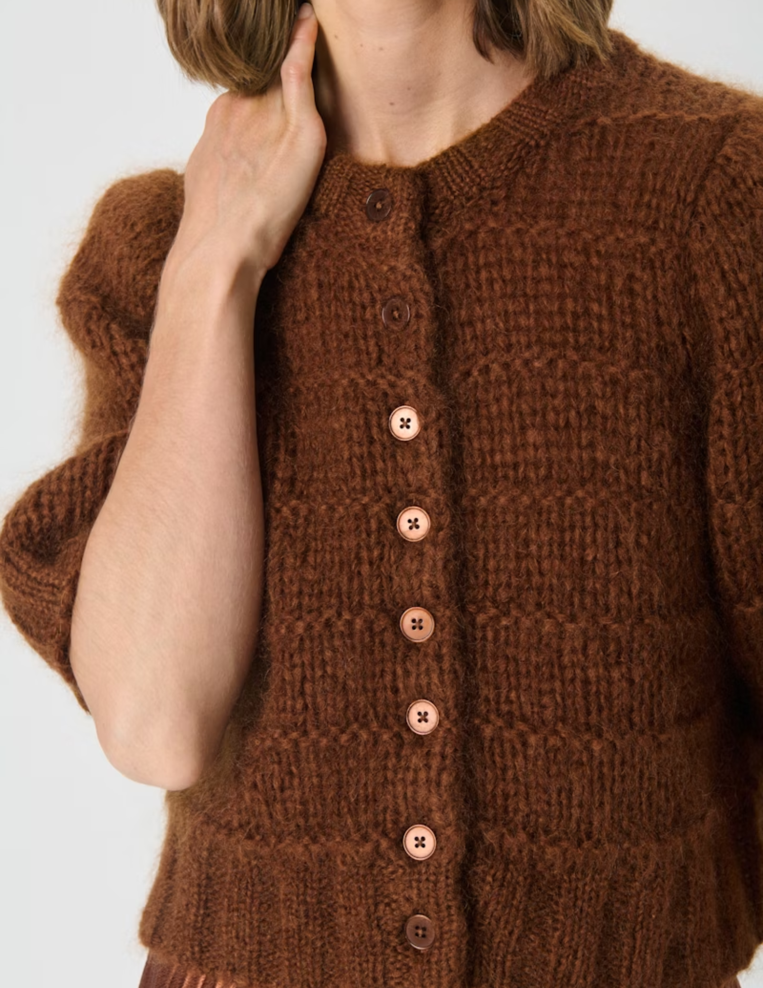 Create an accountThis short-sleeved cardigan in a warm chestnut brown is knitted in a fluffy textured quality with delicate front buttons. The cropped length and soft silhouette make it perfect over a dress or styled with high-waisted pieces. Ideal for layering or worn on its own.