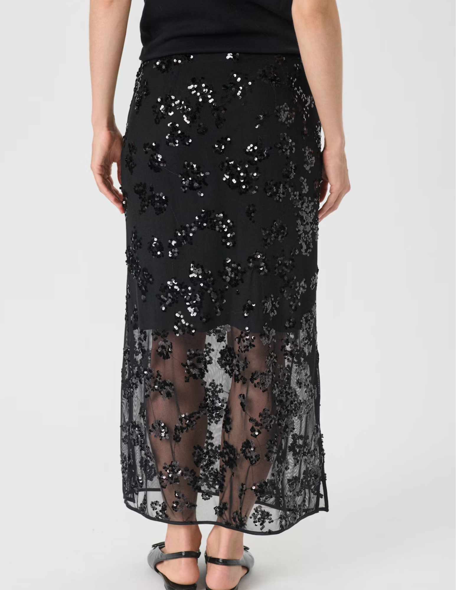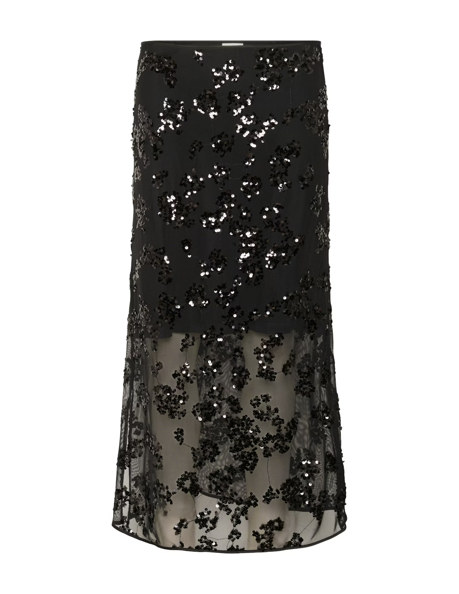 Create an accountThis elegant skirt is adorned with flower-shaped sequins on a sheer overlay that subtly reveals the lining underneath. The fitted silhouette and midi length make it ideal for festive occasions. Style it with a simple top for a balanced and sophisticated look.