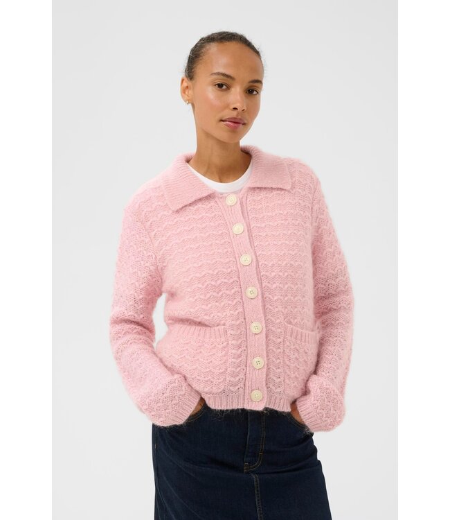 The model is 174 cm tall and wears a size M. This soft pink cardigan in a mohair blend features a delicate open-knit pattern, large buttons, and front pockets. The collar adds a classic touch, while the cropped fit creates a modern silhouette. Perfect over a T-shirt or dress for a feminine and cozy look.