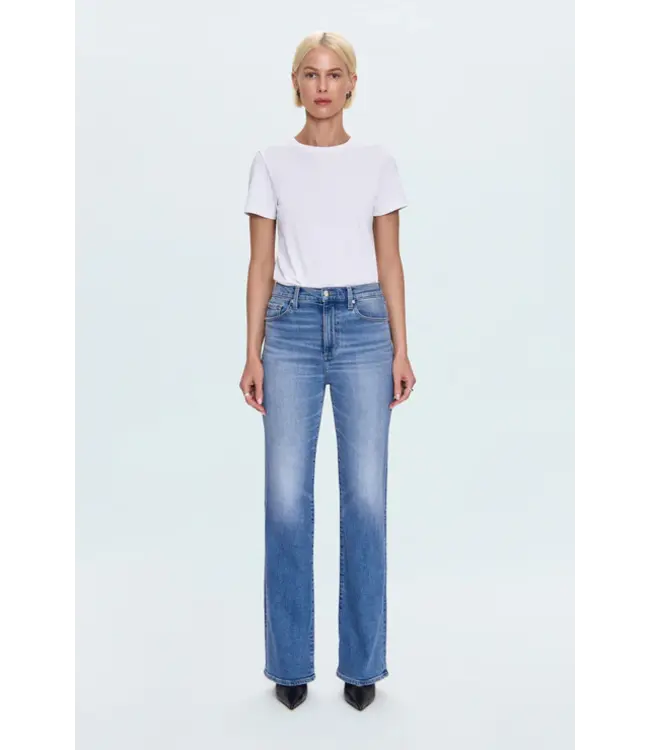 The slim boot that flatters every frame, Evie sits high at the waist with a slim fit through the hips and thighs that opens to a subtle flare, creating long, balanced lines. The full-length 33" inseam elongates the leg for a flattering finish. Crafted from comfort stretch denim in Illusion, a medium indigo wash with soft fading and whiskering that feels effortlessly lived-in.