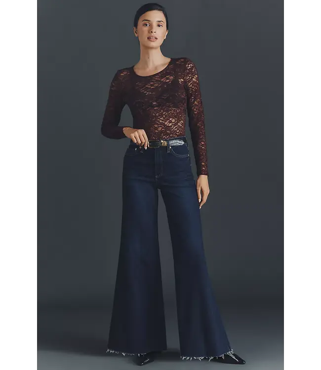 The Izzy mid rise wide leg showcases an slim top block and exagerrated wide leg silhouette with an unexpected kick flare to hem.