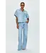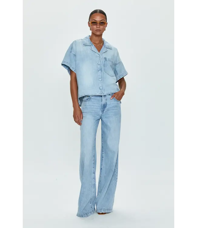 The it-girl fit; Jadyn is designed to sit low on the hips, with a relaxed palazzo leg silhouette. Crafted from a lightweight rigid denim without stretch that holds it shape and offered in a cool blue light wash with vintage fading and whiskering.