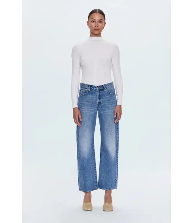 Our best-selling jean that understands proportion, Lexi features a mid-rise and bowed straight leg with a subtle curve through the knee for effortless shape. Finished with a 29" inseam and clean hem for a polished finish. Crafted from rigid denim in Metropolis, a medium indigo wash with authentic fading and whiskering that delivers lived-in character.