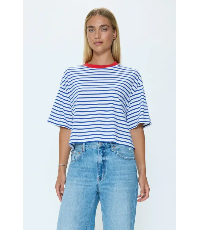 Mae updates the essential tee with an oversized fit, crisp short sleeves, and clean, cropped length. The open-back cutout softens the silhouette and adds a subtle, feminine reveal. In a blue and white stripe with a contrasting red banded collar, this Springtime essential brings versatility to a classic, borrowed-from-the-boys shape.