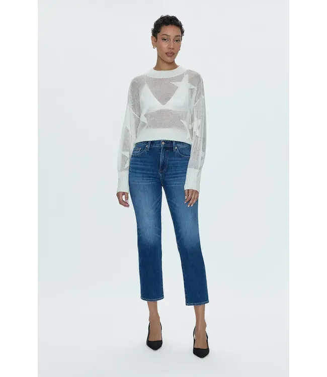 Relaxed, wear-everywhere cigarette silhouette with a cropped leg crafted from our super stretch denim for a figure hugging fit. Vermont is a dark blue indigo wash with fading, laser whiskering details and a clean finished hem.