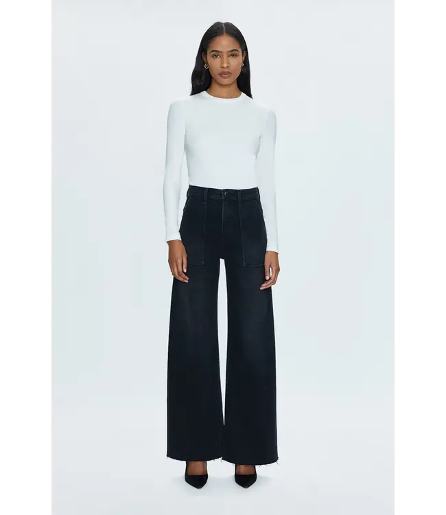 High rise waist, with a wide leg silhouette, front patch pockets and a full length hemline. Crafted from our signature comfort stretch denim, Collins is a washed black denim with utility style patch pockets.