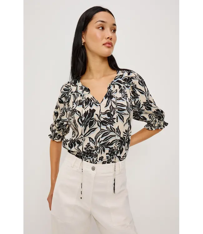 The Belina is an airy, lightly textured poplin top featuring a gathered, peasant-style V-neckline with self ties, a loose, flowing silhouette, and elbow-length sleeves with elastic ruffle cuffs. 86% Lyocell | 14% Nylon Imported.