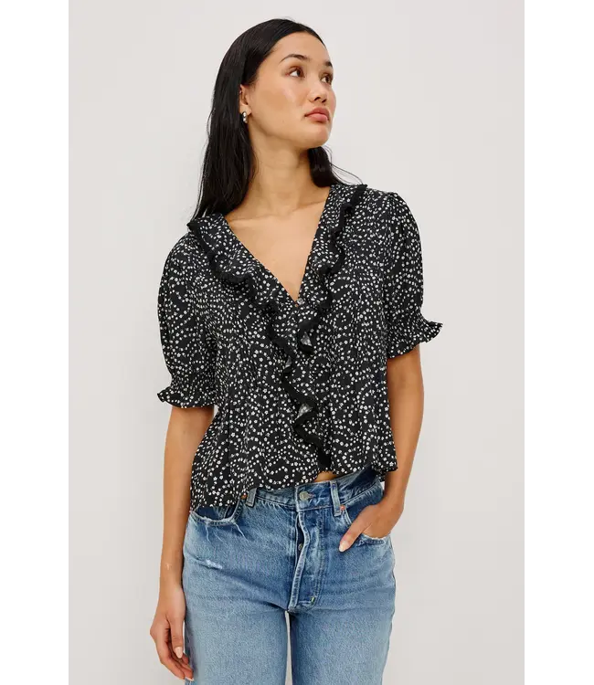 Lightly-textured poplin shapes the Bloom, a loose, relaxed-fit shirt with a cascading ruffled deep V-neckline, front buttons, puff sleeves with smocked cuffs, pintuck detailing, and crochet trim. 86% Lyocell | 14% Nylon Imported.