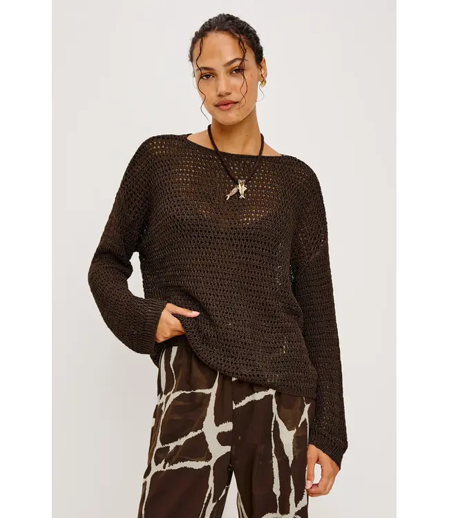 The Evangeline Sweater features an open-weave, oversized silhouette with relaxed dropped shoulders and long sleeves for refined, layerable ease. 75% Viscose | 25% Polyester Imported.