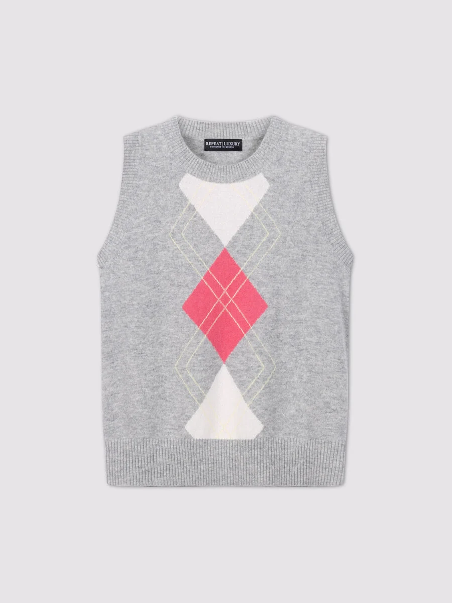 Create an accountSpun from GOTS-certified organic cashmere, this fine, lightweight knit feels exceptionally soft and showcases a multicolor argyle motif with a subtle ribbed hem. The cropped, slim silhouette features a crew neckline and sleeveless ease. Layer over shirting or under a blazer for polished work-to-weekend wear by REPEAT cashmere.