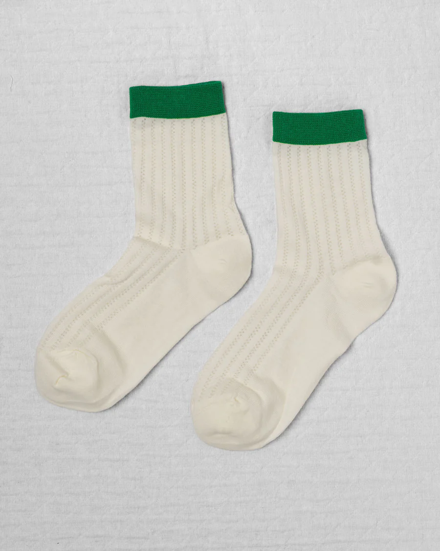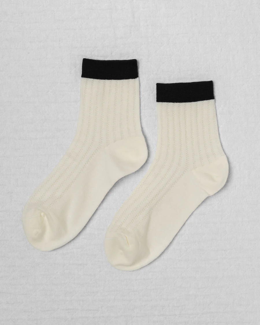 Create an accountA refined take on everyday essentials, our Sunday Socks are crafted in a soft cotton pointelle knit that feels both delicate and modern. The airy texture offers a subtle femininity, while the clean, contrasting cuff lends a distinctly sporty finish. Designed to move effortlessly between sneakers, loafers, or kitten heels, they infuse a feminine polish to casual dressing.