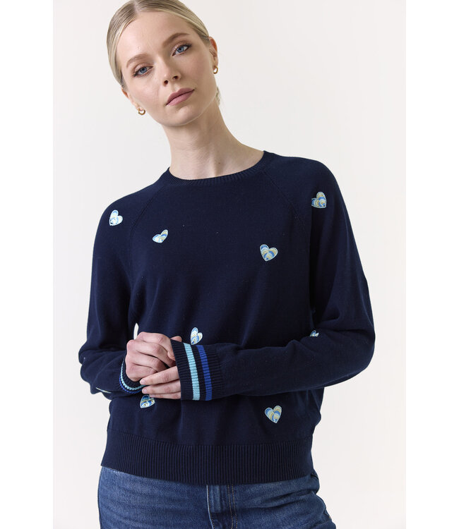 Raglan sleeve pullover with embroidered multicolour hearts.