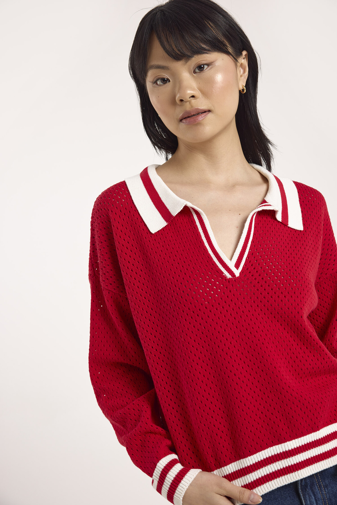 Create an accountDropped shoulder open collar pullover. Slightly boxy fit.
