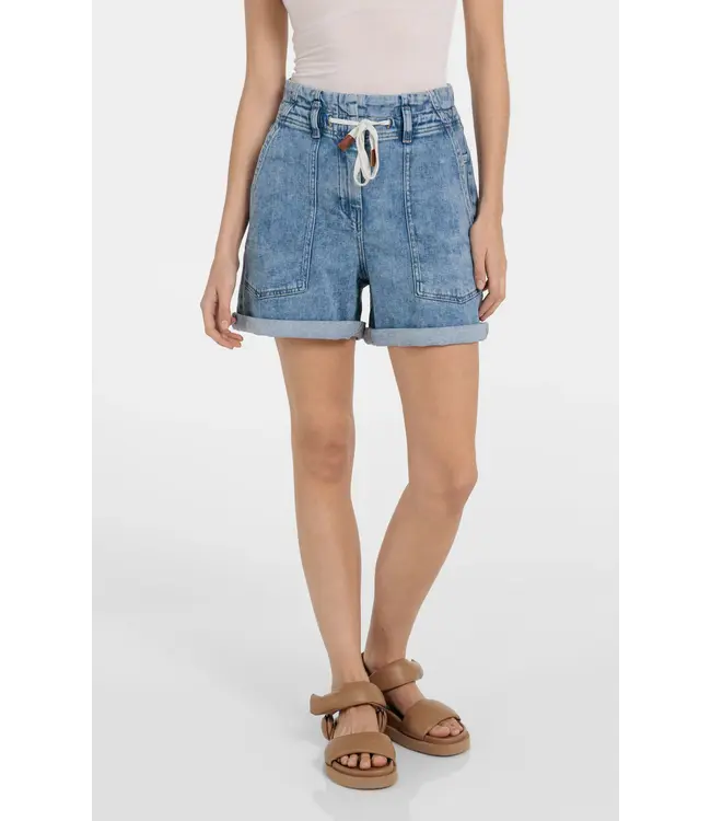 These comfortable shorts are crafted from soft denim and feature a relaxed fit. The elastic waistband with drawstring adds a casual touch and ensures extra comfort. Designed with large patch pockets at the front, welt pockets at the back, and loosely rolled hems that are not fixed. A perfect summer piece to pair with your favorite tops. The model is 176 cm and wears size 36.