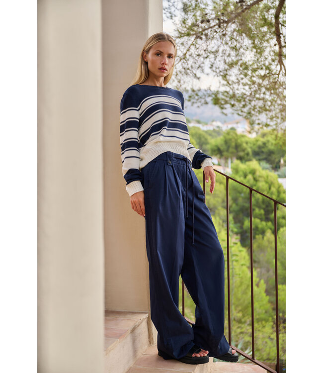 This finely knitted sweater features a classic stripe pattern, round neckline, and long sleeves. The back is finished with a subtle button and keyhole detail. Designed with a regular fit and ribbed trims, it offers both comfort and a stylish look. The model is 178 cm and wears size S.